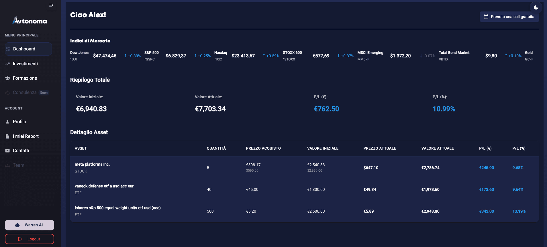 Avtonoma è la una rivoluzionaria piattaforma italiana di consulenza finanziaria digitale completamente indipendente. Ti aiuta a capire, migliorare e far crescere i tuoi investimenti, con un mix unico di intelligenza artificiale e supervisione umana. È pensata per chi ha già investito e vuole ottimizzare, ma anche per chi parte da zero e cerca una guida affidabile.